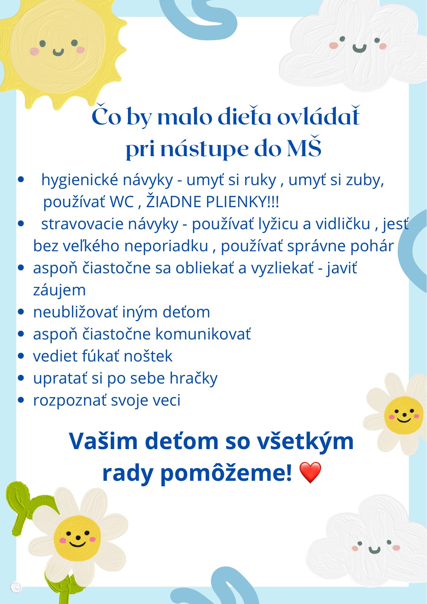 pri nástupe do materskej školy netreba , aby Vaše dieťa všetko zvládlo dokonale a samostatne, Každé dieťa je iné , má svoje tempo a to je úplne v poriadku. Dôležité je najmä to , aby malo základné návyky a chuť skúšať nové veci - napr. javiť záujem o obliekanie , či vyjadriť aspoň čiastočne svoje potreby.